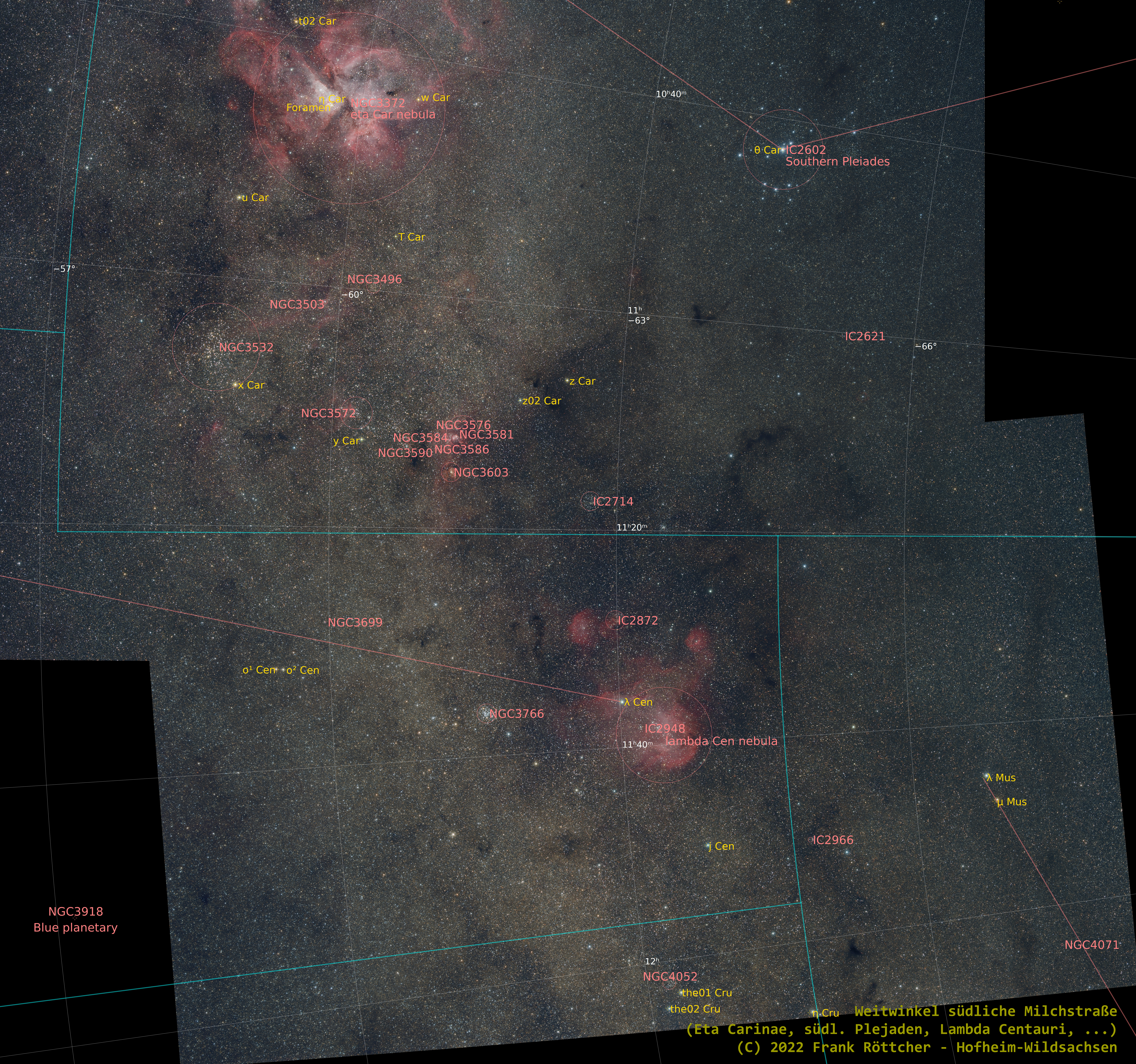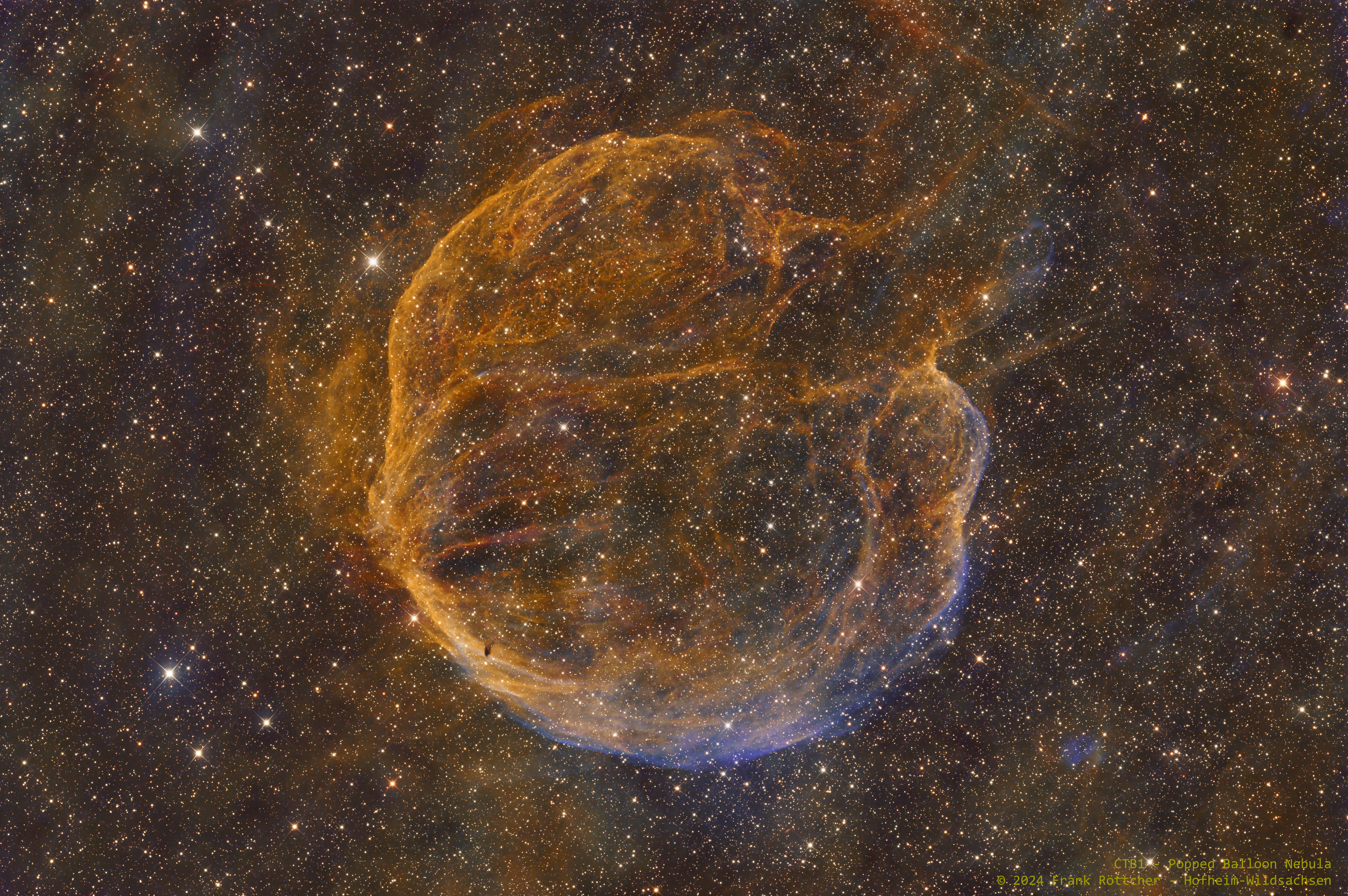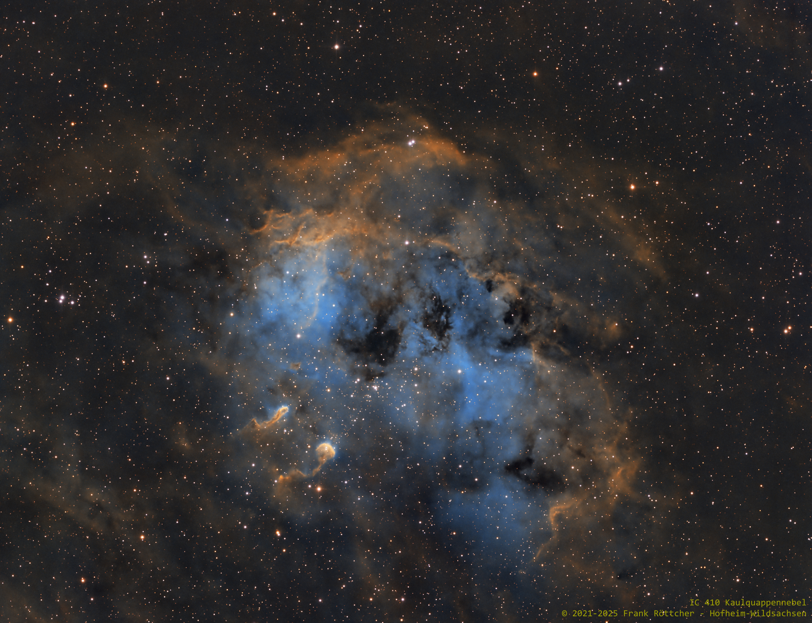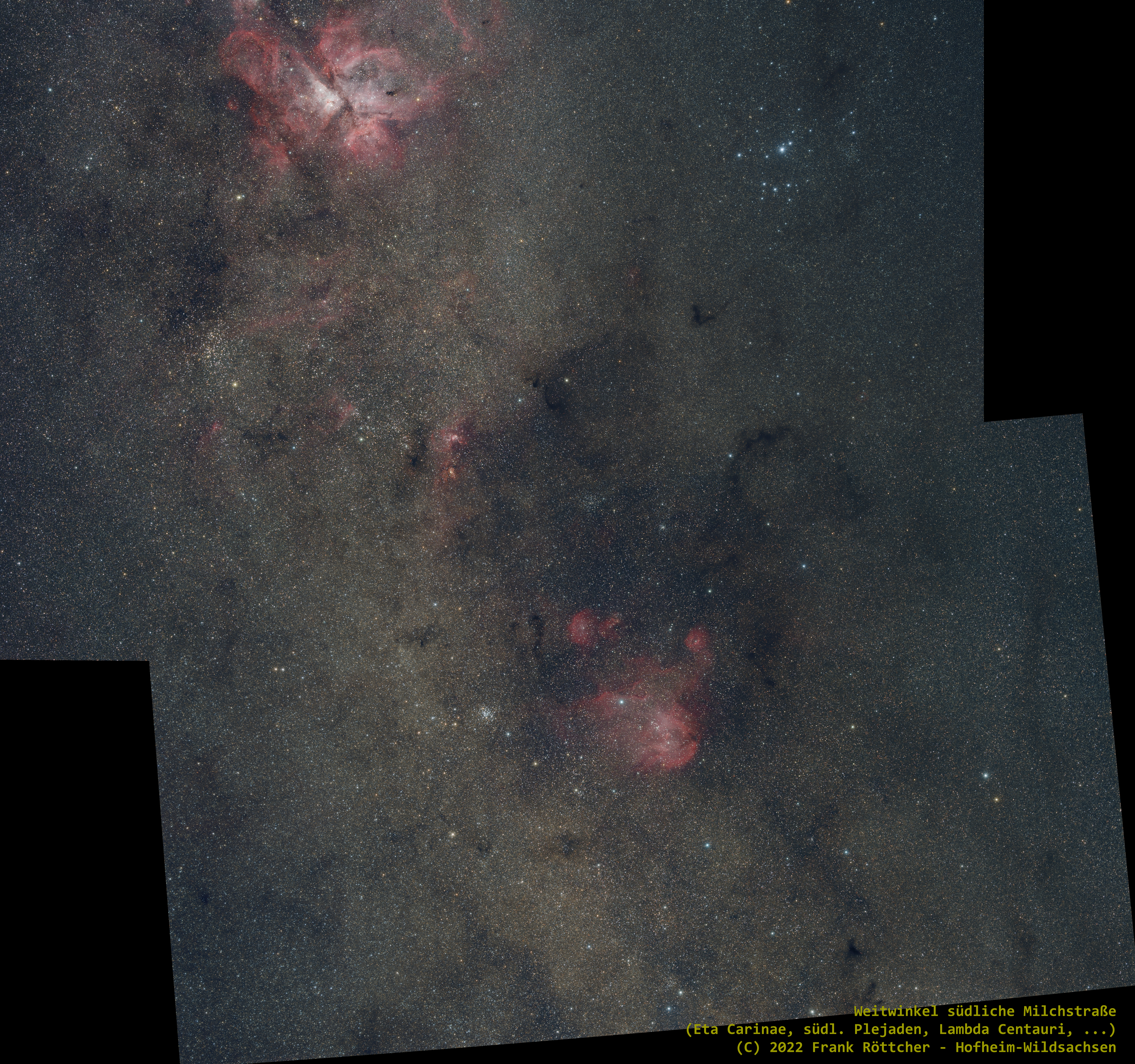 2025/08 NGC 7000 - Die große Wand im Schwan 2025/04 M98 und M108 - Eulennebel mit Spiralgalaxie 2025/03 Jones-Emberson 1 (PK 164+31.1) Headphone Nebula 2021-25 IC410 Kaulquappennebel 2024/08 CTB1 - Popped Balloon Nebel in SHO 2024/08 CTB1 - Popped Balloon Nebel in HOO 2024/07 Irisnebel 2024/05 NGC6357 Hummernebel 2024/05 IC45892 - Blauer Pferdekopfnebel 2024/05 NGC6188 - Fighting Dragons of Ara 2024/05 NGC 3372 - Eta Carinae Nebel 2023/09 LDN1235 Dunkler Haifisch-Nebel 2023/08 NGC7635 Der Blasennebel 2023/07 NGC6888 Mondsichelnebel / Crescent Nebula 2023/06 Sh2-101 Tulpennebel mit Cygnus X-1 2022/08 NGC6914 Ein Reflexionsnebel in einer HII Region im Sternbild Schwan 2022/04 M16 Adlernebel mit den Säulen der Schöpfung 2022/04 IC 2944 Lambda Centauri Nebel (Running Chicken Nebula) 2022/04 Mosaik der Region um Eta Carinae, die südlichen Plejaden und den Running Chicken Nebel 2022/04 Mosaik der Region um Eta Carinae, die südlichen Plejaden und den Running Chicken Nebel ANNOTIERT Galaxies and ClustersOur Solar System