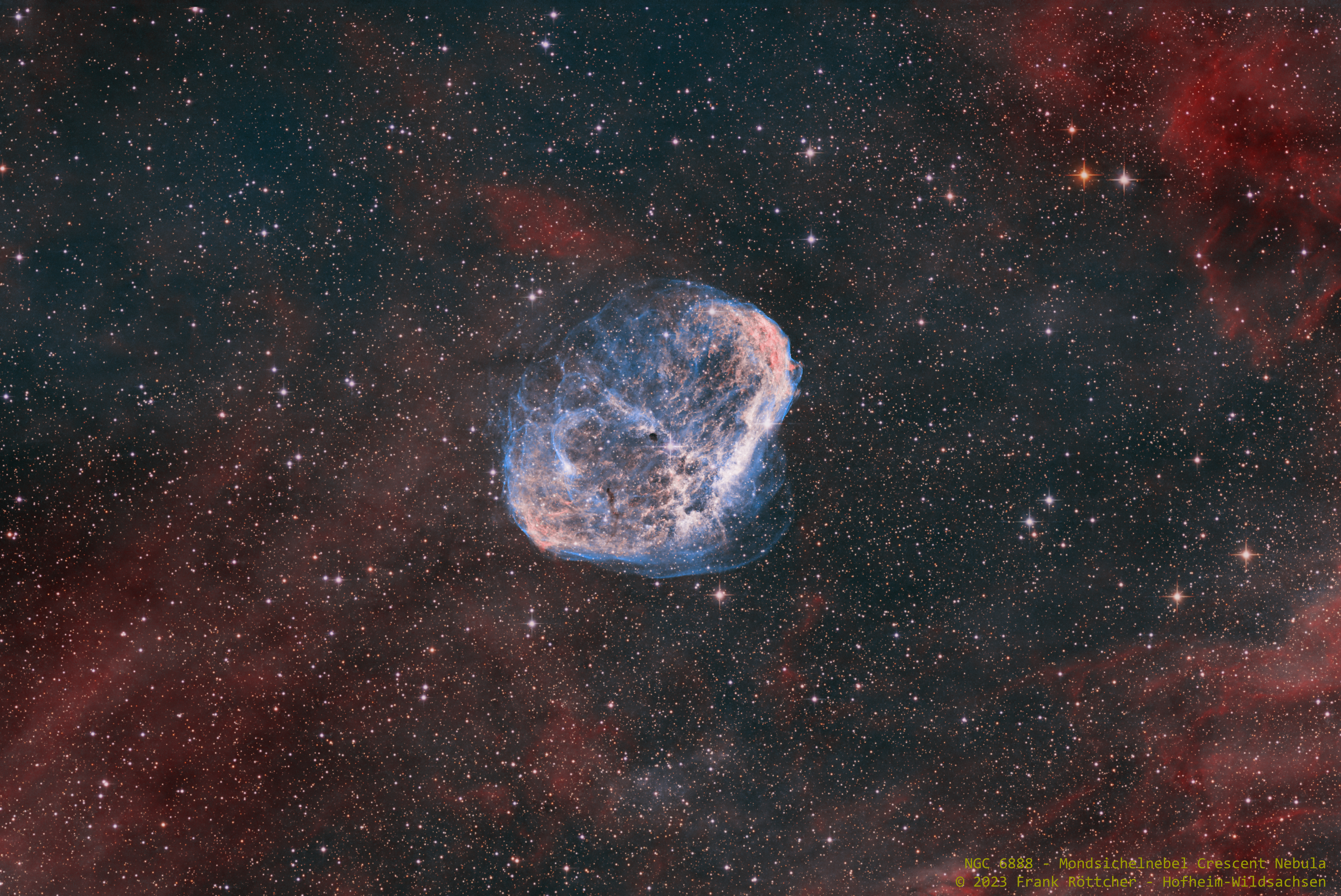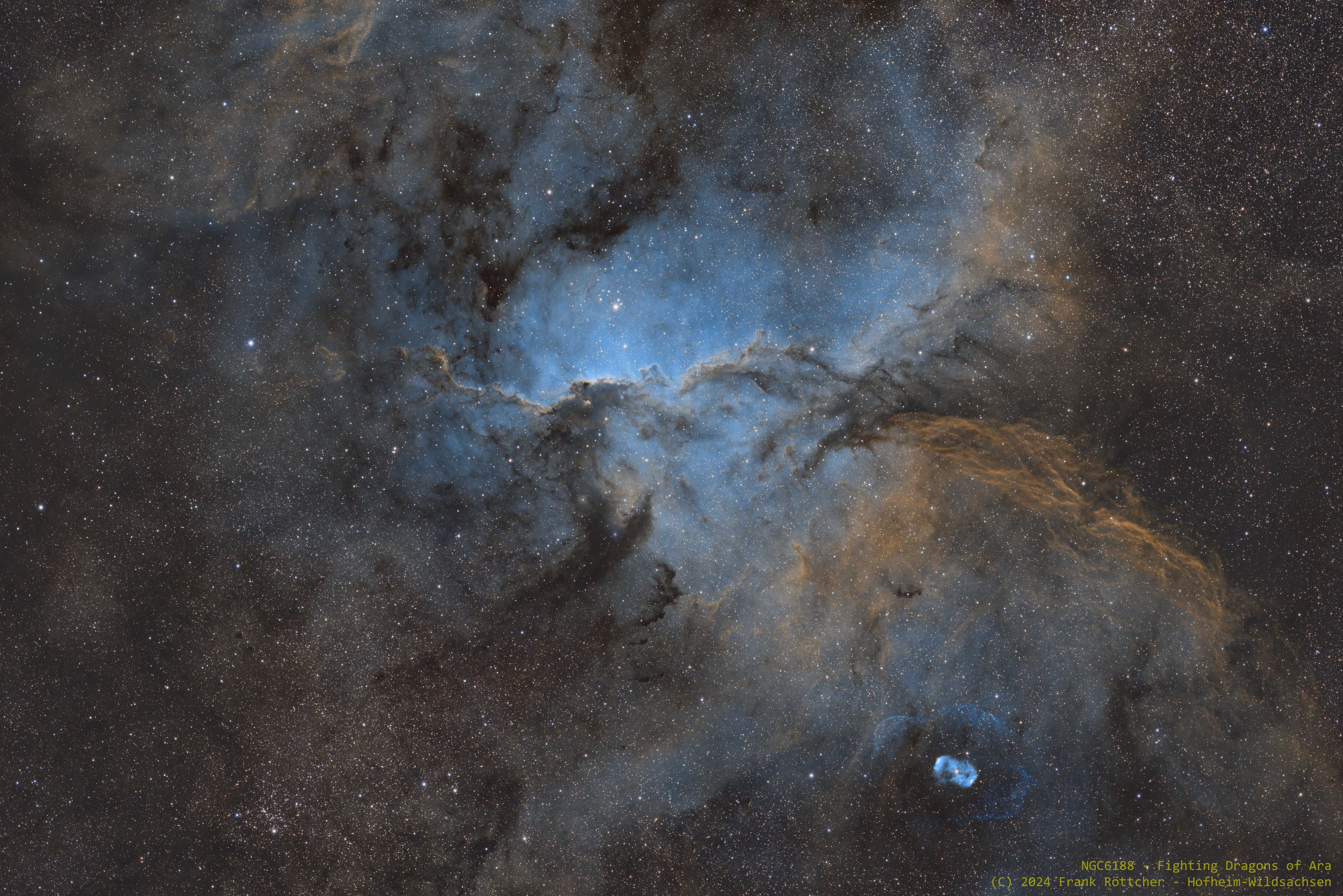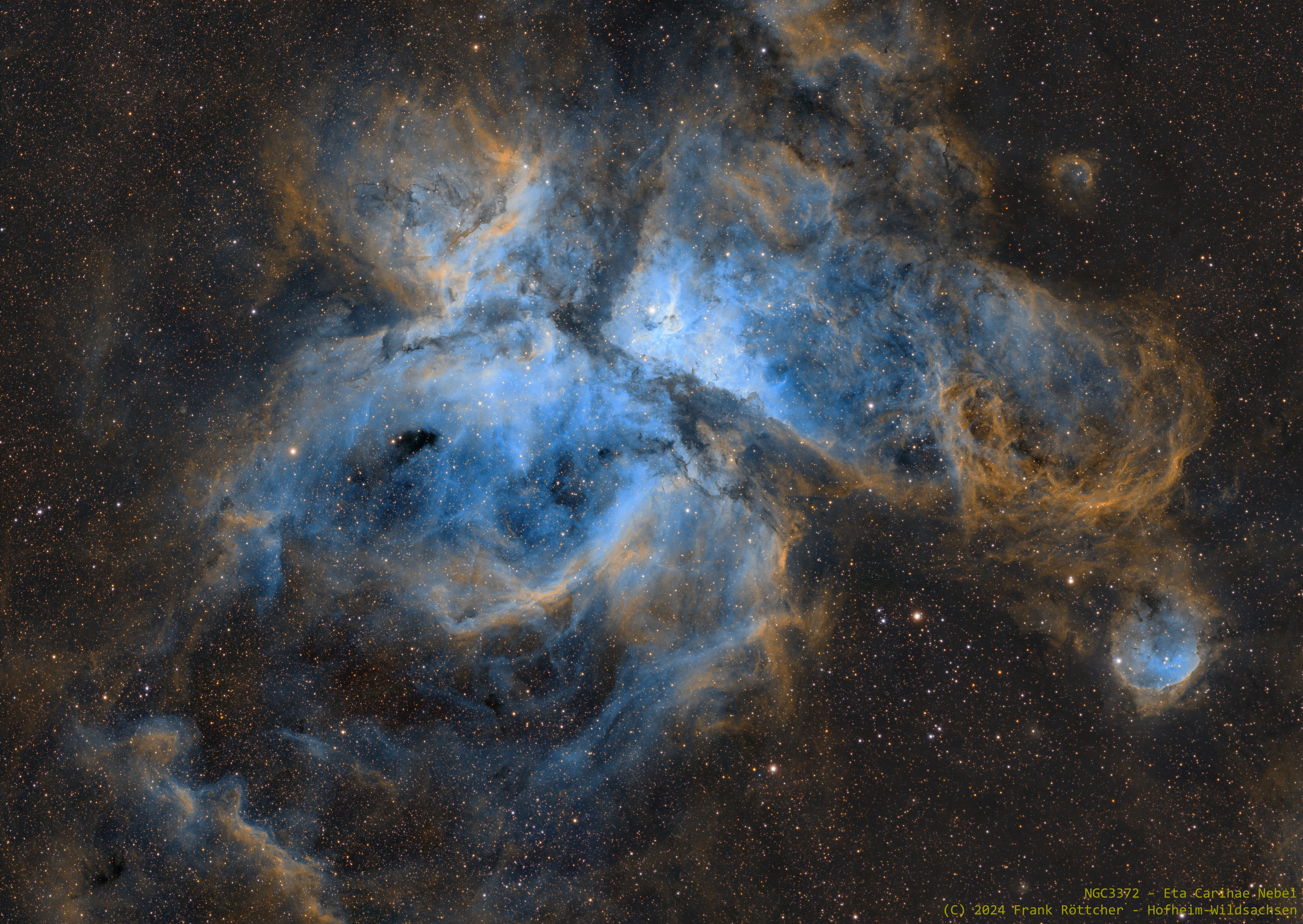 2025/08 NGC 7000 - Die große Wand im Schwan 2025/04 M98 und M108 - Eulennebel mit Spiralgalaxie 2025/03 Jones-Emberson 1 (PK 164+31.1) Headphone Nebula 2021-25 IC410 Kaulquappennebel 2024/08 CTB1 - Popped Balloon Nebel in SHO 2024/08 CTB1 - Popped Balloon Nebel in HOO 2024/07 Irisnebel 2024/05 NGC6357 Hummernebel 2024/05 IC45892 - Blauer Pferdekopfnebel 2024/05 NGC6188 - Fighting Dragons of Ara 2024/05 NGC 3372 - Eta Carinae Nebel 2023/09 LDN1235 Dunkler Haifisch-Nebel 2023/08 NGC7635 Der Blasennebel 2023/07 NGC6888 Mondsichelnebel / Crescent Nebula 2023/06 Sh2-101 Tulpennebel mit Cygnus X-1 2022/08 NGC6914 Ein Reflexionsnebel in einer HII Region im Sternbild Schwan 2022/04 M16 Adlernebel mit den Säulen der Schöpfung 2022/04 IC 2944 Lambda Centauri Nebel (Running Chicken Nebula) 2022/04 Mosaik der Region um Eta Carinae, die südlichen Plejaden und den Running Chicken Nebel 2022/04 Mosaik der Region um Eta Carinae, die südlichen Plejaden und den Running Chicken Nebel ANNOTIERT Galaxies and ClustersOur Solar System